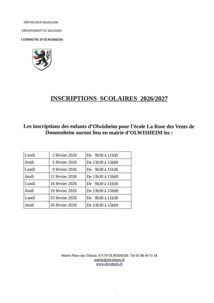 Les inscriptions des enfants d’Olwisheim pour l’école La Rose des Vents de Donnenheim auront lieu en Mairie d’Olwisheim à compter du 2 février 2026